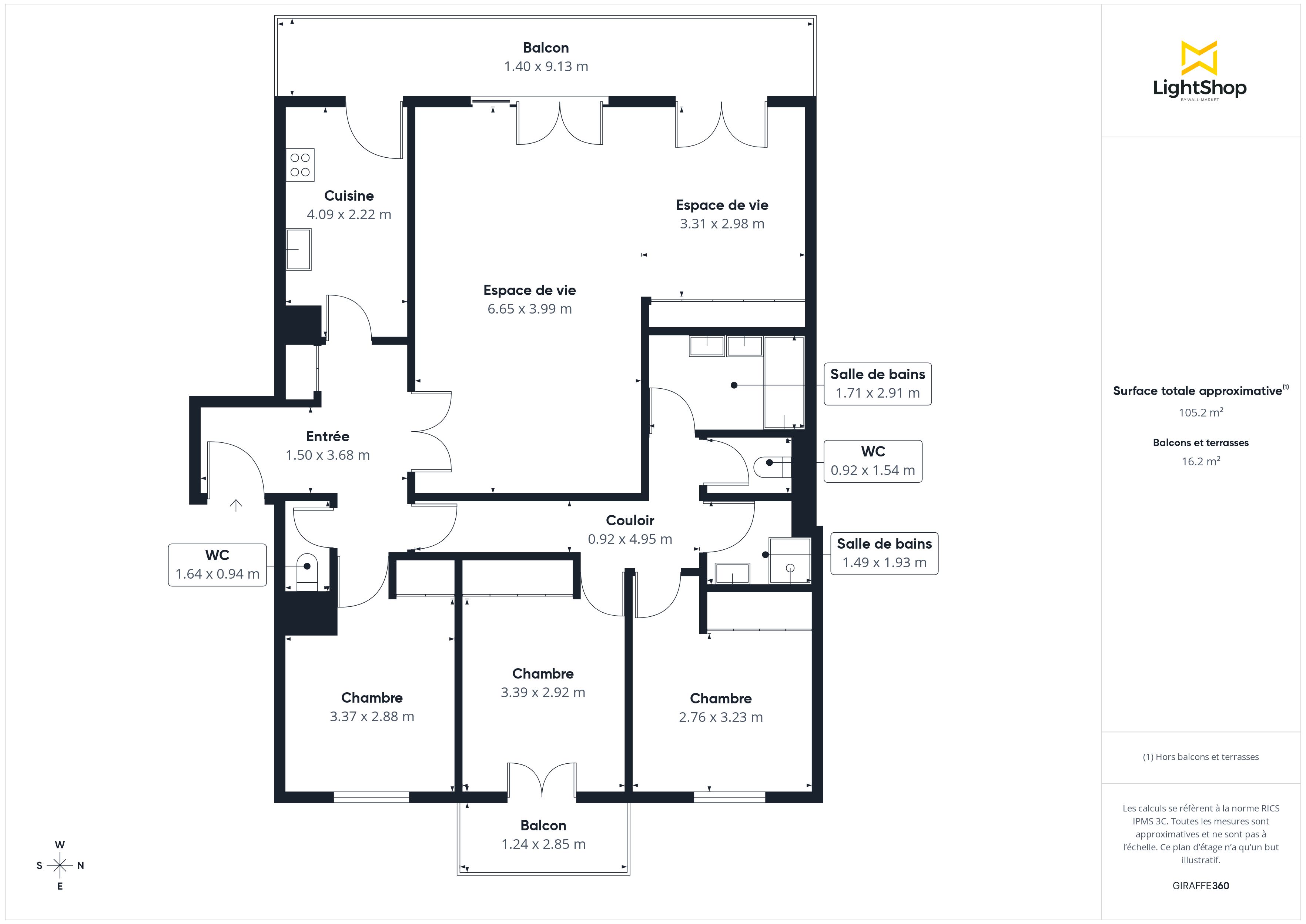 L’appartement, situé au 1er étage avec ascenseur, dispose également de deux extérieurs : un grand balcon/terrasse côté rue d’environ 15 mètres de long et un second balcon côté chambres.