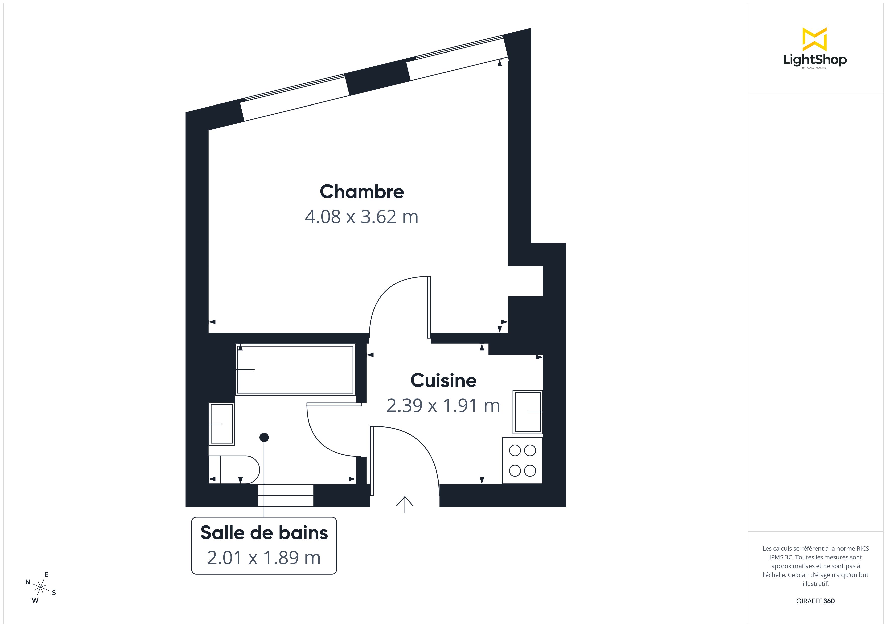 L'agencement du studio comprend une pièce principale avec une cuisine ouverte, une salle de bains équipée d'une installation électrique pour le chauffage et l'eau chaude.