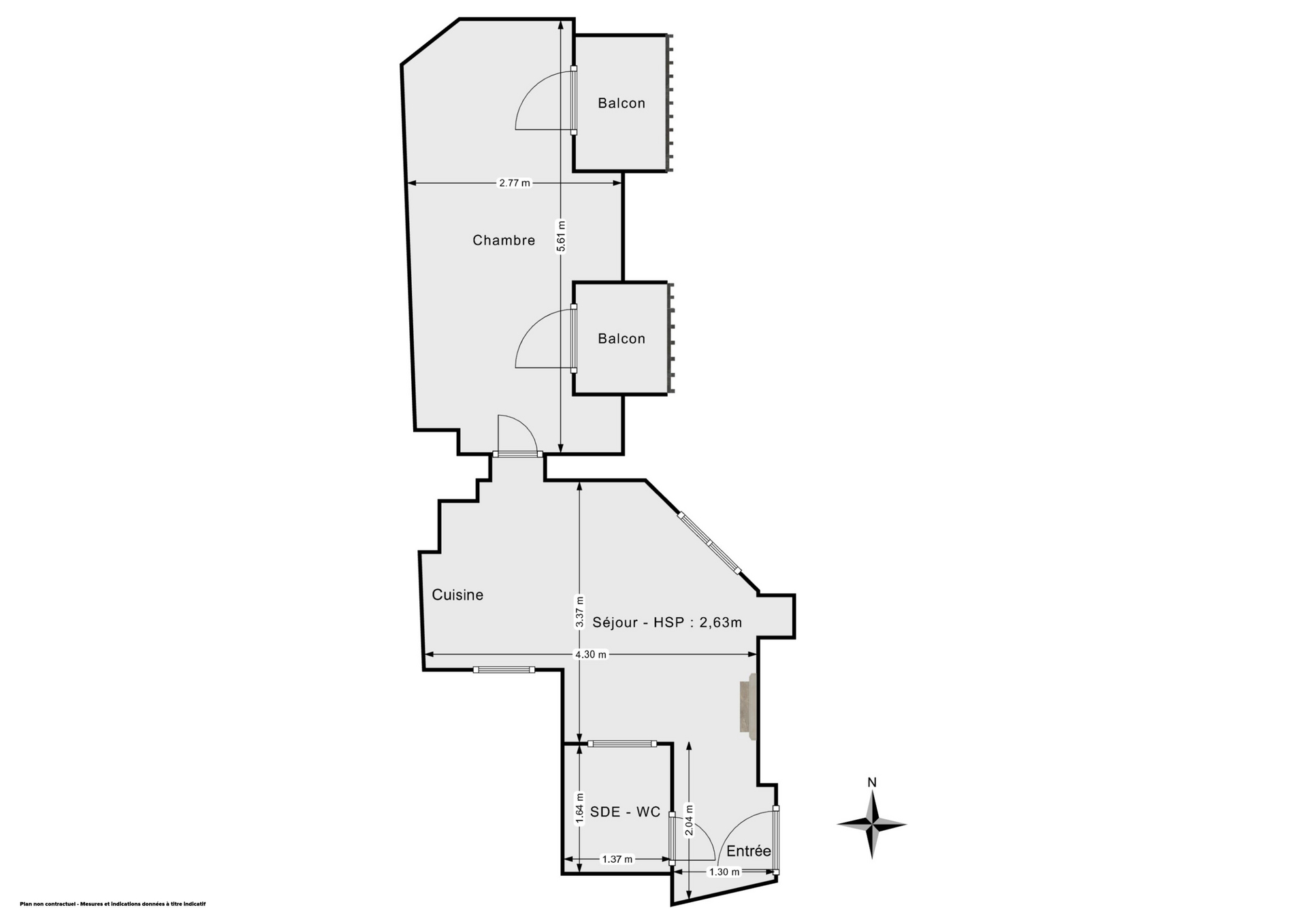 L'appartement se compose d'une entrée, d'un séjour avec cuisine ouverte entièrement équipée de 11,17 m² exposé Est et Sud, d'une chambre de 12,64 m² donnant sur deux balcons, et d'une salle d'eau avec WC Sanybroyeur (déclaré et en parfait état de fonctionnement).
