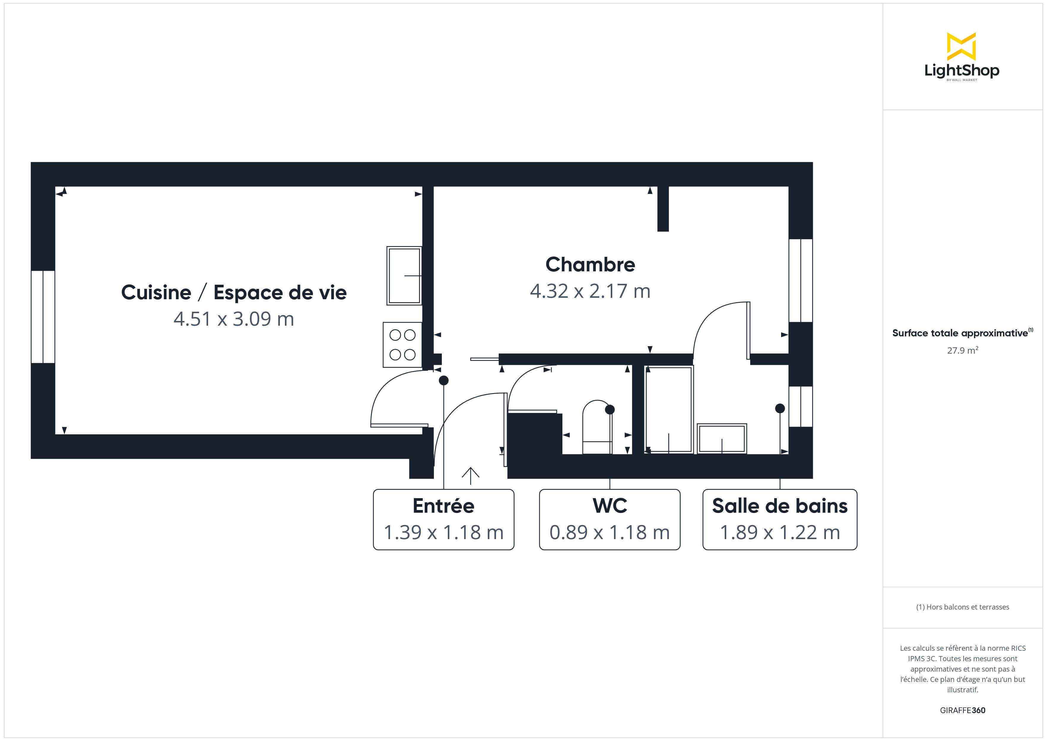 L’appartement offre un agencement optimisé sans perte de place. Il se compose d’une entrée, d’un séjour de 19 m² exposé nord-ouest avec cuisine ouverte entièrement équipée, d’une chambre de 9,5 m² sur cour, avec salle de bain attenante comprenant baignoire, simple vasque et espace buanderie. Des toilettes séparées complètent le bien.