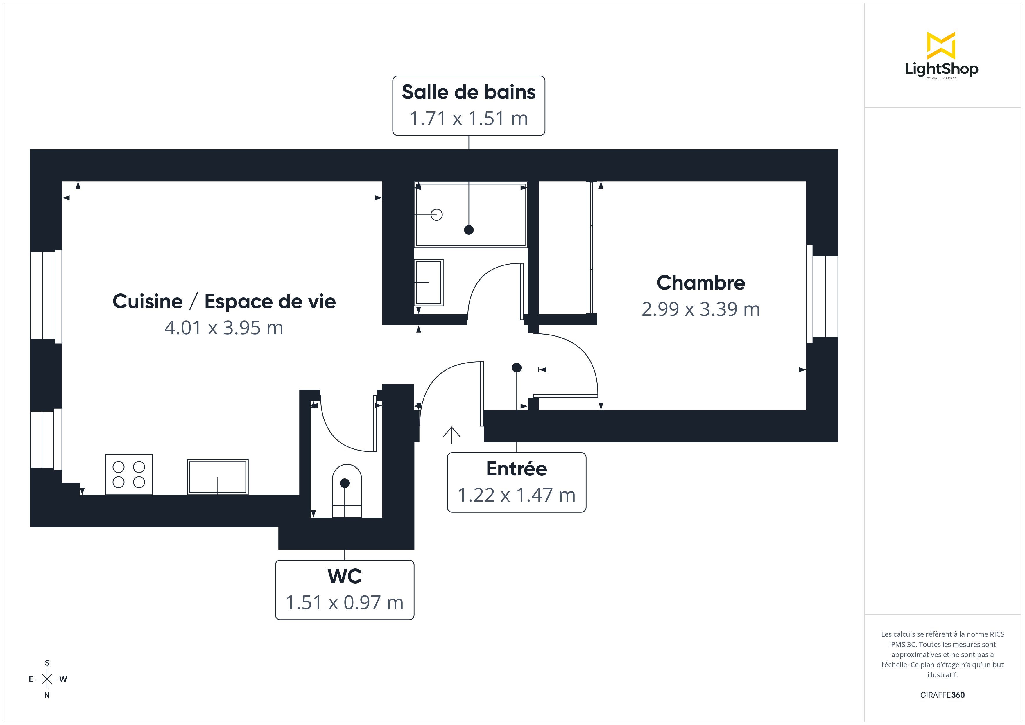 - Une salle d'eau équipée d'une douche, d'une vasque simple, d'un sèche-serviette et bénéficiant d'une aération naturelle.