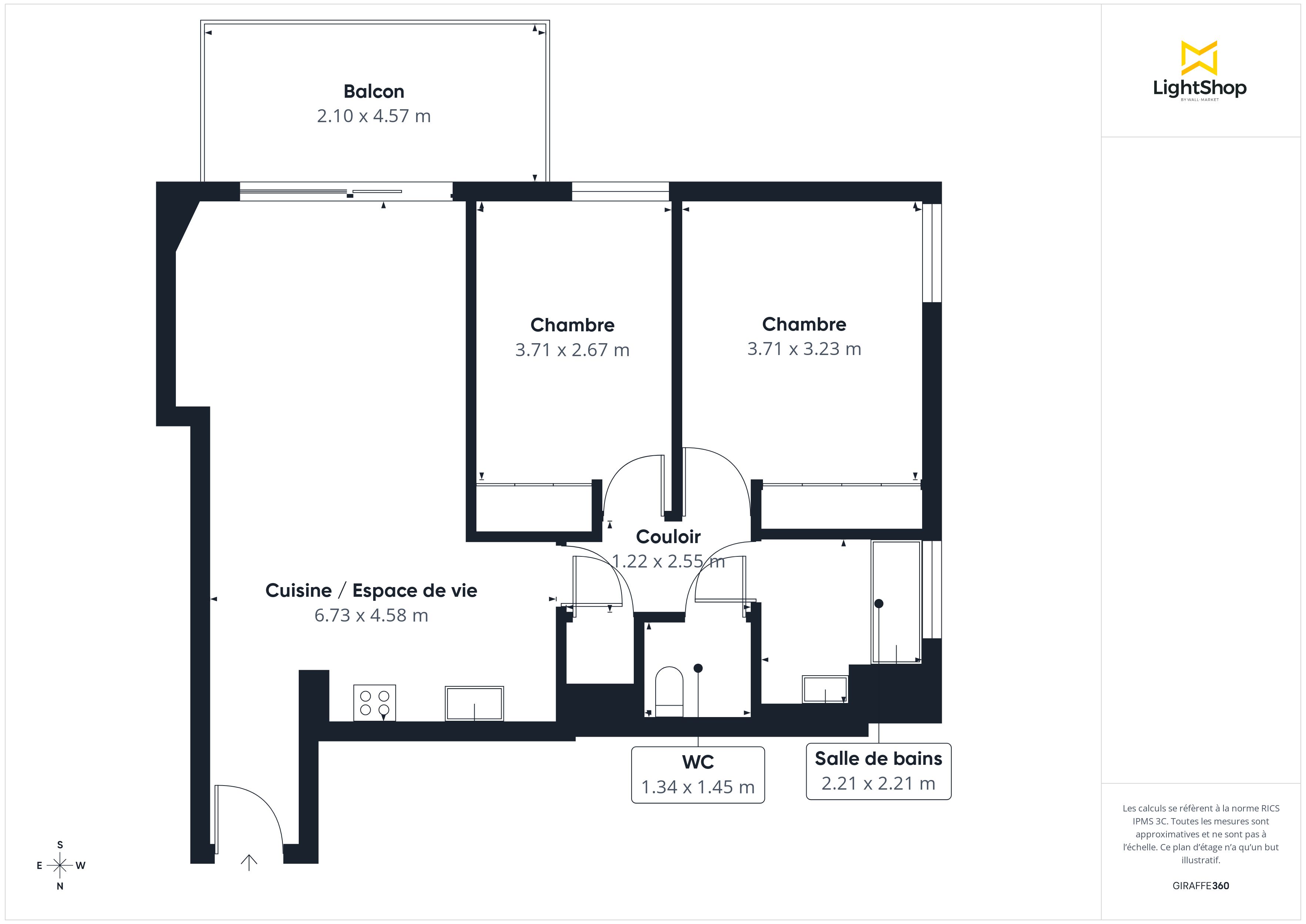 L'agencement comprend un séjour avec une cuisine ouverte équipée, une buanderie avec raccordement pour machine à laver, et un espace nuit avec deux chambres pourvues de placards intégrés. La salle de bain bénéficie d'une fenêtre, d'une vasque et d'un sèche-serviette électrique. Les toilettes sont séparées. L'appartement est doté de volets roulants manuels sauf dans le séjour ou les volets sont électriques.