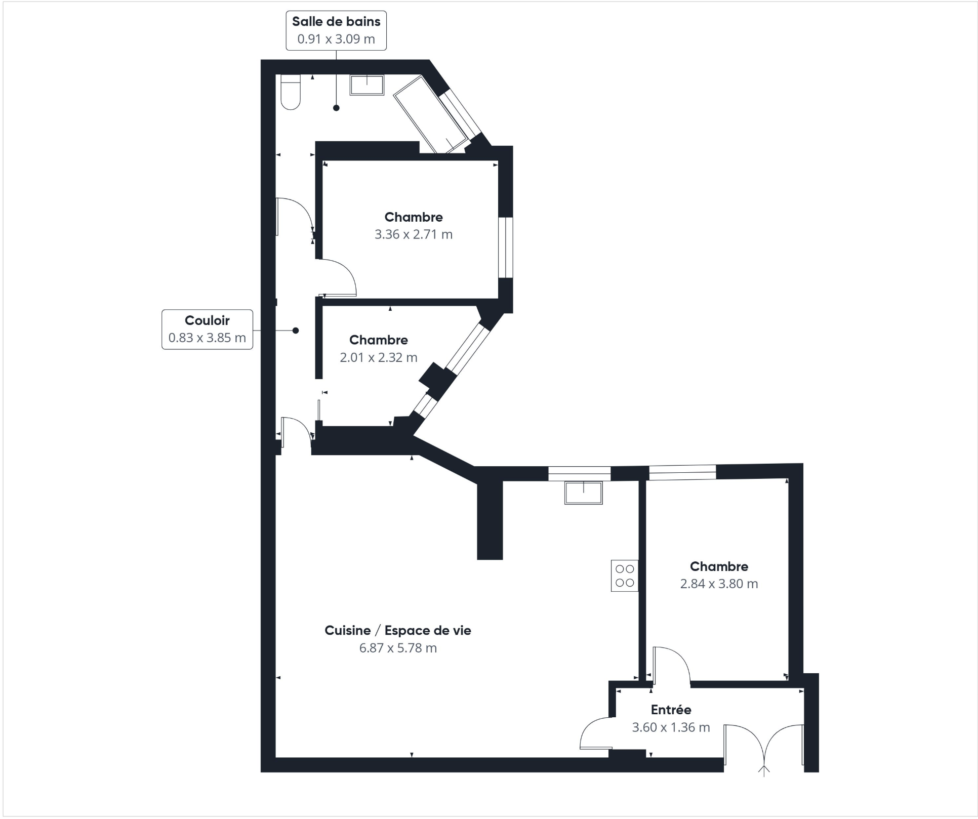 L’appartement se compose d’une entrée, d’un grand double séjour lumineux de 36.33 m² avec cuisine américaine équipée, de deux chambres de 11,02 m² et 9,34 m², ainsi qu'une petite chambre enfant/ bureau de 6,16 m². Il dispose également d’une salle de bain avec coin machine et d’un WC.