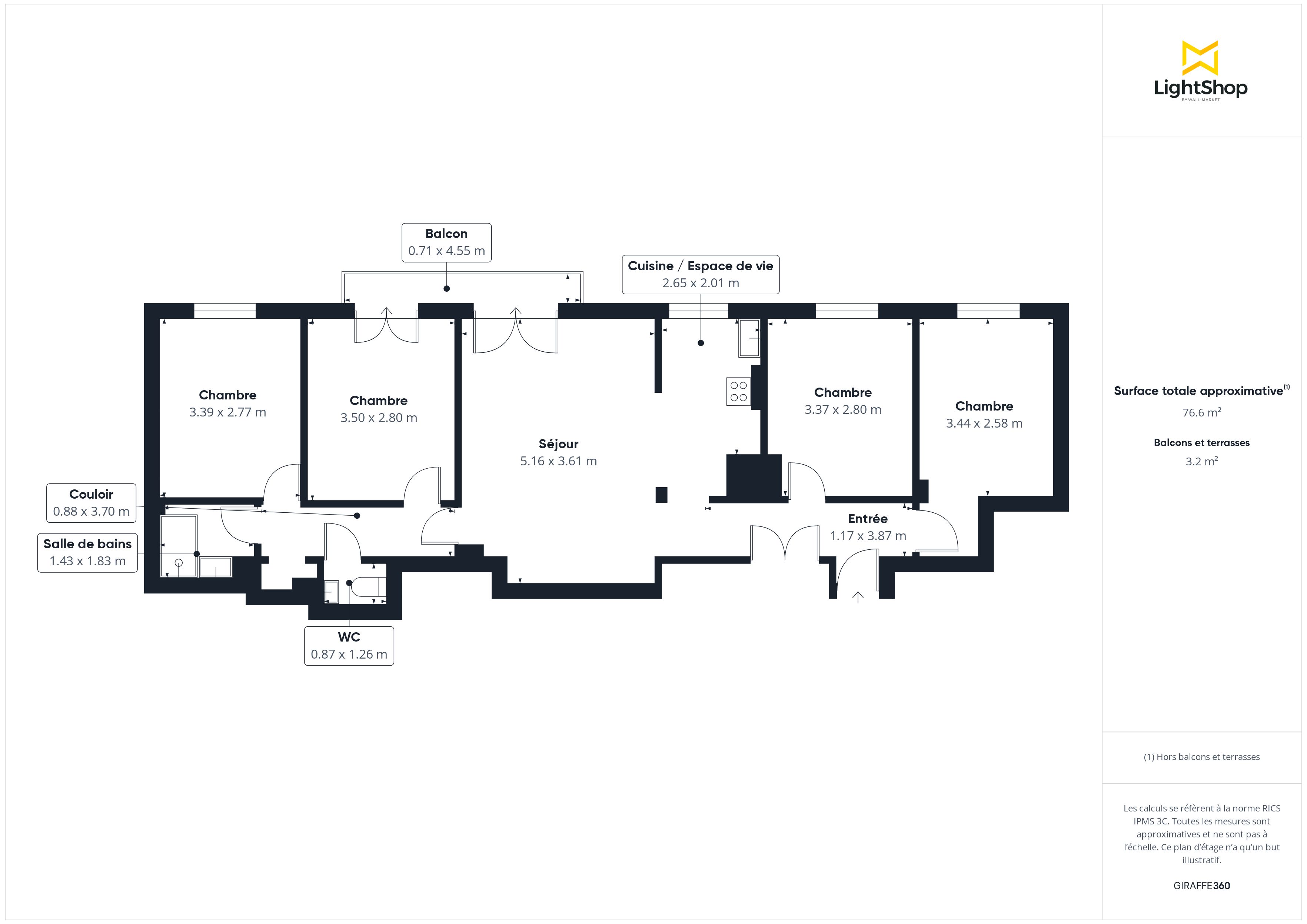 - un séjour de 19 m² s'ouvrant sur un balcon de 2,5 m²,
