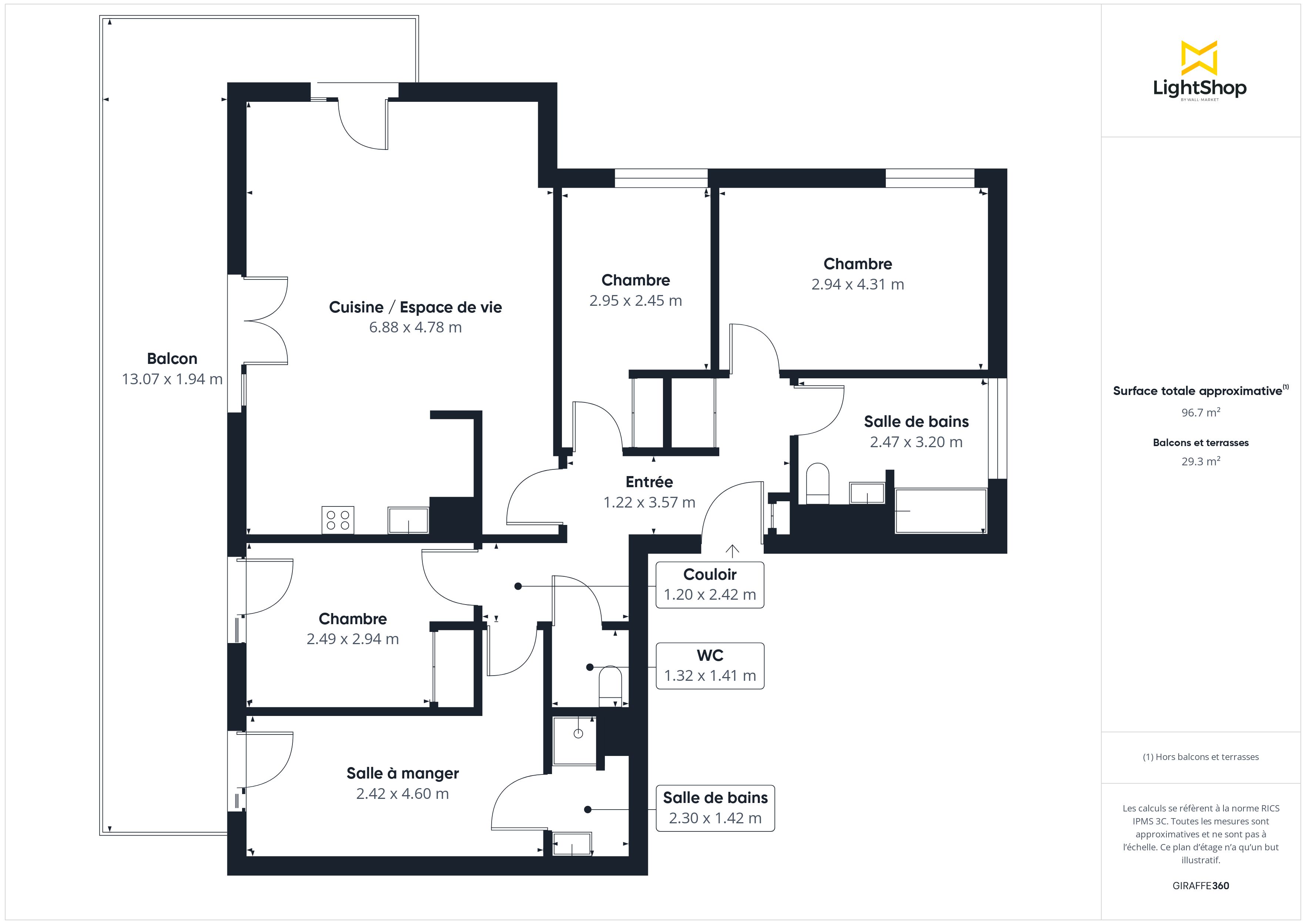 Un immense balcon en L de 29 m², équipé d’un store banne et d’un brise-vent, permet de profiter pleinement de l’extérieur, été comme hiver.